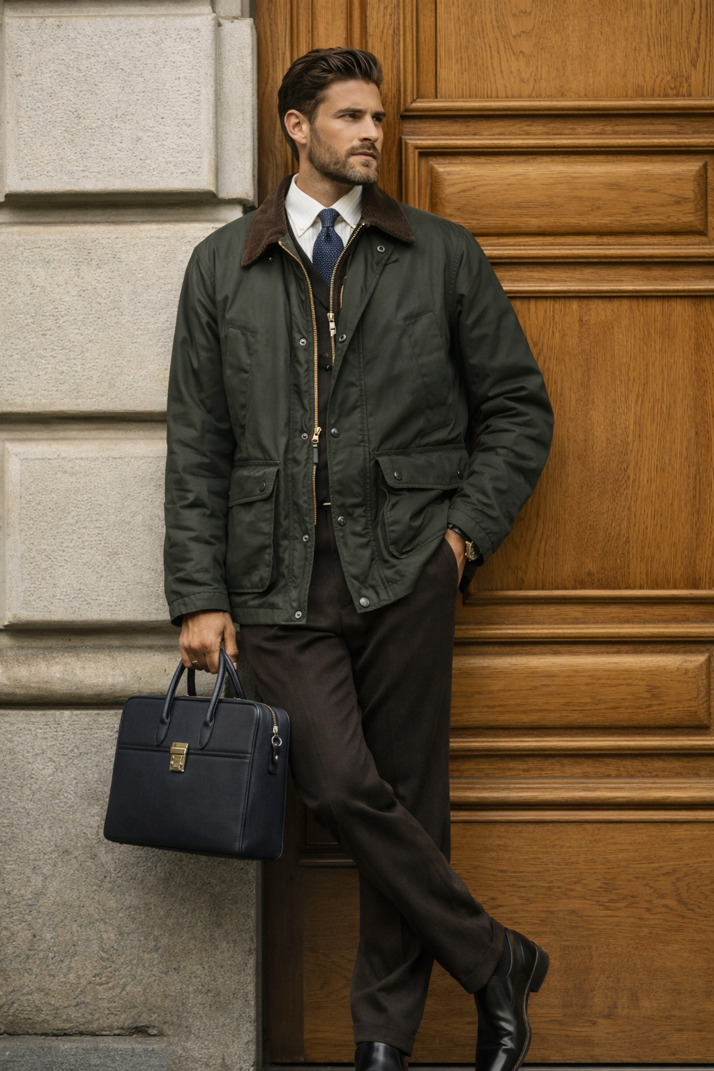 Veste col velours pour homme, coupe droite, toile déperlante effet huilé, doublure tartan. Élégance intemporelle et fonctionnelle. L’essentiel du vestiaire Maison Gentleman.